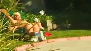 "Two blonde lesbians pleasing each other in the backyard"