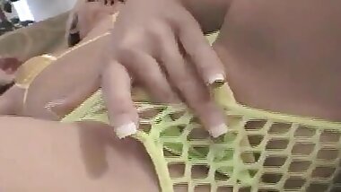 "Long Legged Brunette Takes Off Jean Mini Skirt and Shows Off In Heels and Hose"