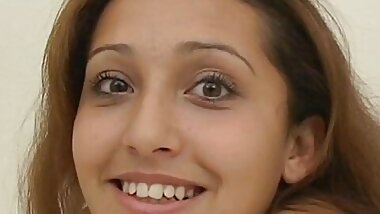 "A horny brunette lady from Germany stuffing a long dildo deep inside her muff"