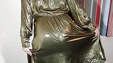 "hot tv crossdresser in super silky gold shiny dress"